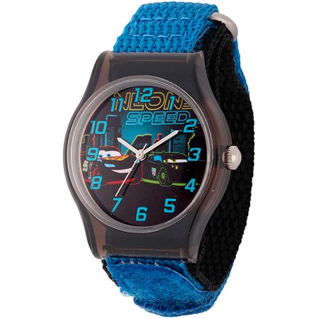 Disney Cars Boys' Plastic Case Watch, Blue Nylon Strap:33mm plastic case16mm blue nylon strapDial features CarsVelcro claspMineral glass crystalStainless steel casebackJapanese quartz movementWater resistance to 100'Case dimensions: 33mm x 40mm x 11mmStrap dimensions: 16mm x 7.5\