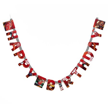 Cars Birthday Party Banner, Party Supplies: Happy Birthday hanging letter bannerMeasures 7.59'Strings on both ends for easy hangingCars party decoration features Lightning McQueen and other characters from Disney's Cars 2Ideal party decorations for a kid's birthday party or Cars 2-themed partyColorful Disney Cars party supply banner